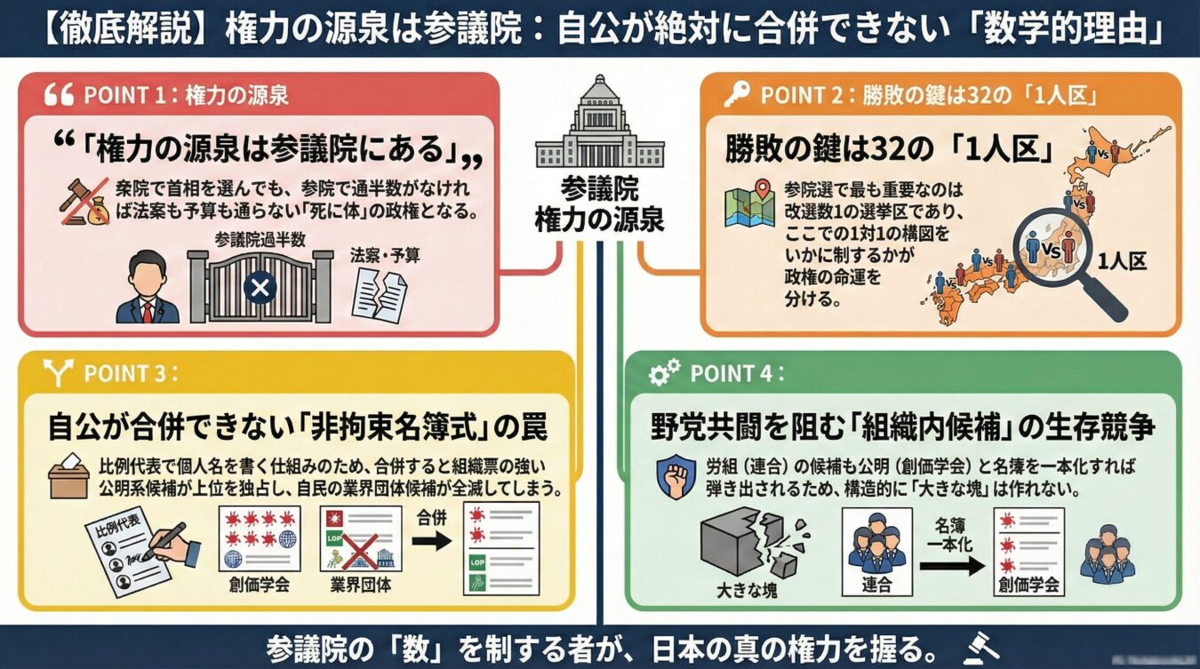 - 合併の不可能性: 参院比例(非拘束名簿)で自公が合併すれば、圧倒的集票力を持つ公明党(創価学会)候補が上位を独占し、自民党の集票マシーン(業界団体)が全滅する。