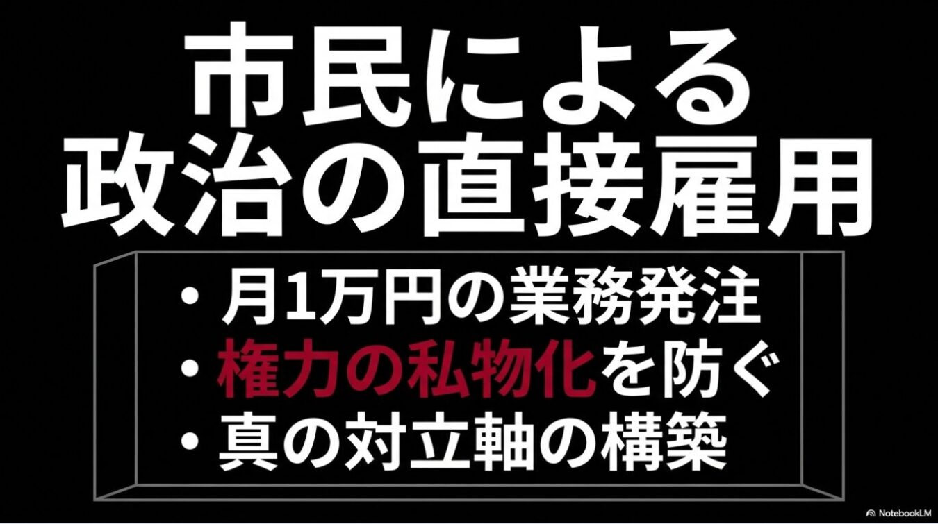 黒い背景に白字で「市民による政治の直接雇用」と大きく掲げられ、その下に「月1万円の業務発注」「権力の私物化を防ぐ」「真の対立軸の構築」という3項目が箇条書きで記されたスライド画像。