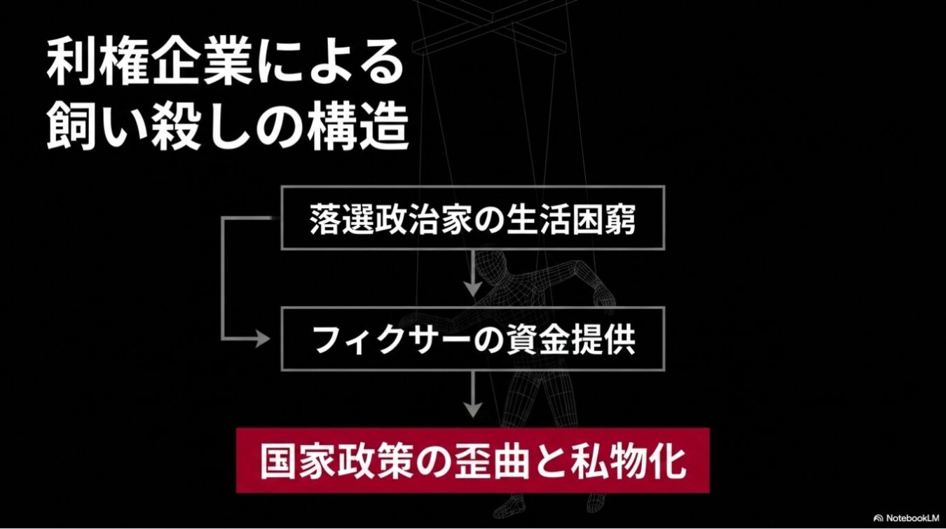 「利権企業による飼い殺しの構造」というタイトルの下で、落選した政治家の生活困窮とフィクサーの資金提供が結びつき、結果として国家政策が歪められ私物化される様子を示したフローチャート。