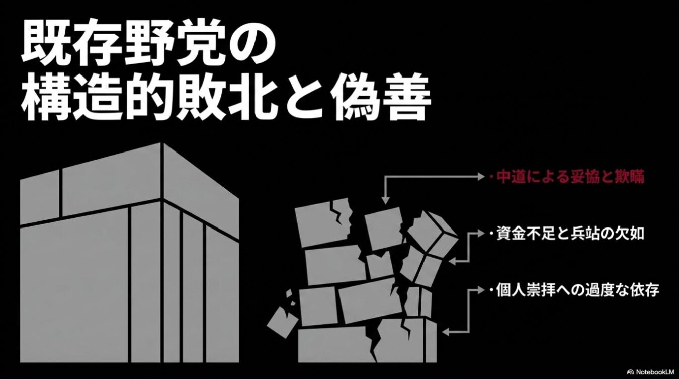 既存野党の構造的敗北と偽善をテーマに、左側に完全な建物、右側に崩壊した建物の図解と、その崩壊要因として「中道による妥協と欺瞞」「資金不足と兵站の欠如」「個人崇拝への過度な依存」という3つの項目が矢印で示されたグラフ。