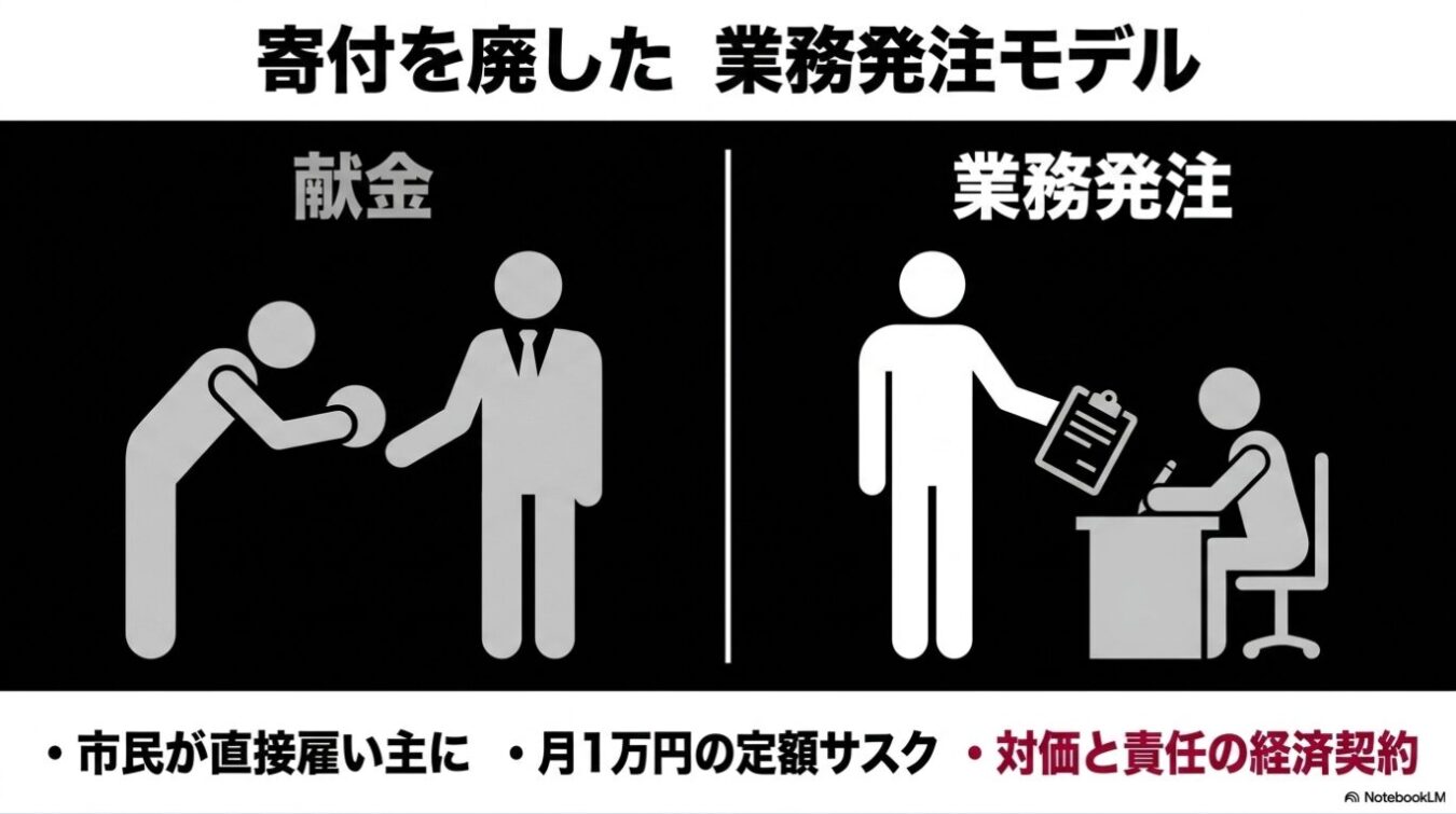 これは「かわいそうだから」という善意の寄付ではありません。私たちが身銭を切って政治家にお金を払い、約束を守らせる「業務発注」です。対価と責任を伴う冷徹な経済契約を結ぶことで、政治家を私たちの手で直接コントロールします。