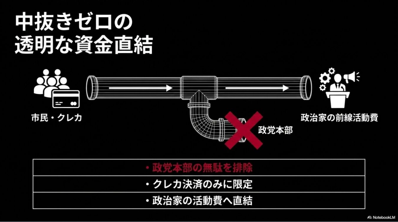 • 市民がスポンサーになる意味: 政治家が胡散臭い利権団体に買われる前に、私たちが直接お金を出し、民主主義を守るための「防衛策」として機能させます。