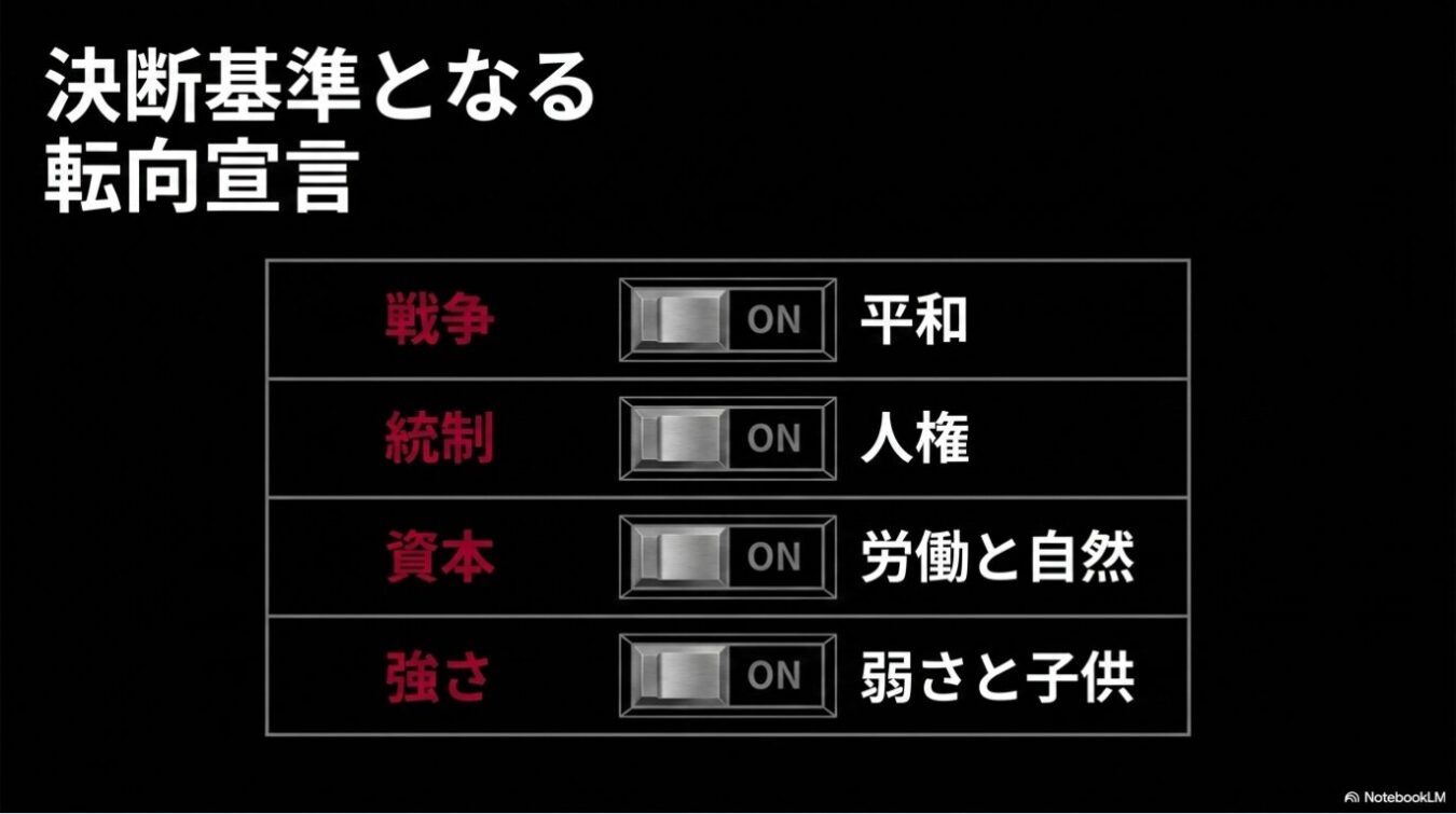 「決断基準となる転向宣言」というタイトルのもと、左側の「戦争」「統制」「資本」「強さ」から右側の「平和」「人権」「労働と自然」「弱さと子供」へと切り替える4つのスイッチが「ON」になっている図。