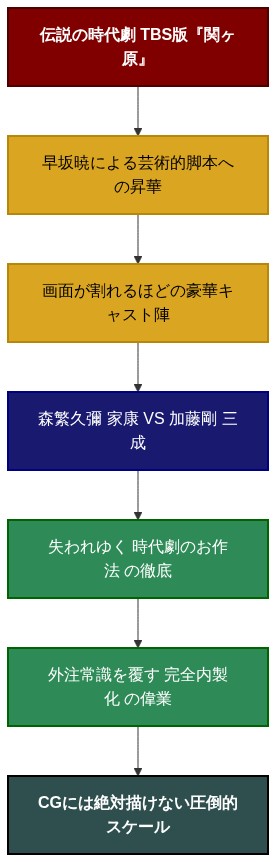 【結論】 かつてTBSが総力を挙げて制作した名作時代劇『関ヶ原』は、単なるテレビドラマの枠を超えた「映像芸術の最高峰」である。昭和の怪物俳優たちによる神がかった名演と、時代劇特有の「お作法」を完全内製化で作り上げた当時のテレビ局の圧倒的な熱量は、CG全盛の現代では絶対に再現できない本物のスケールを誇っている。