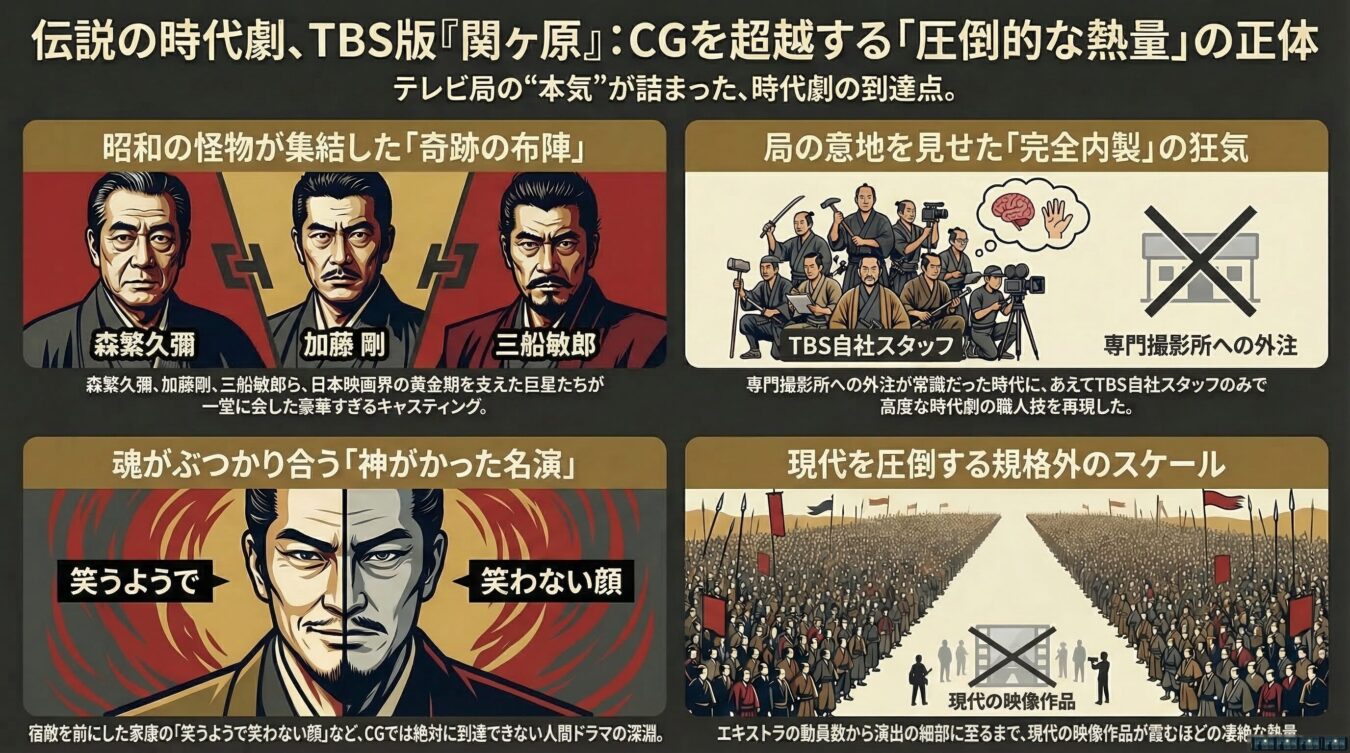 近年、CS放送やBlu-ray化によって再び脚光を浴びている名作時代劇がある。かつてのTBSが局の総力を挙げて制作した『関ヶ原』だ. 現代の映像作品に慣れきった我々の目に、この作品はいかに映るのか。結論から言おう。これこそがテレビマンの「本気」であり、現代のCGでは絶対に到達できない熱量を持った、日本テレビ史に残る記念碑的傑作である。