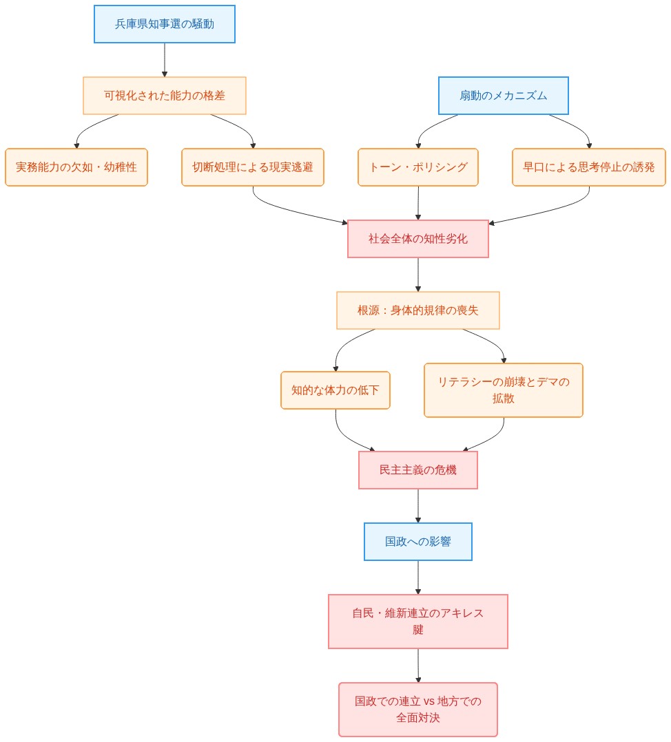 【結論】 兵庫県知事選後の騒動は単なる政治的対立ではなく、現代日本社会が抱える「知性の劣化」と「身体的規律(ディシプリン)の喪失」を浮き彫りにした深刻な症例である。この思考停止の蔓延こそが、次期総選挙における自民・維新の連立構想の根本的なアキレス腱となる。