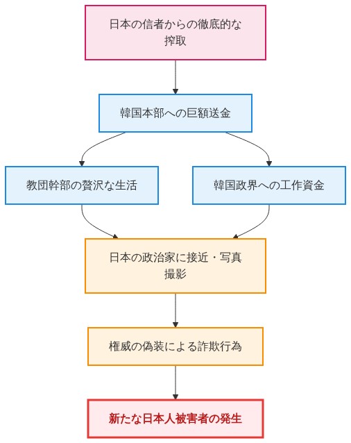 統一教会が日本から富を吸い上げるメカニズムは、一連の明確な流れで構成されています。