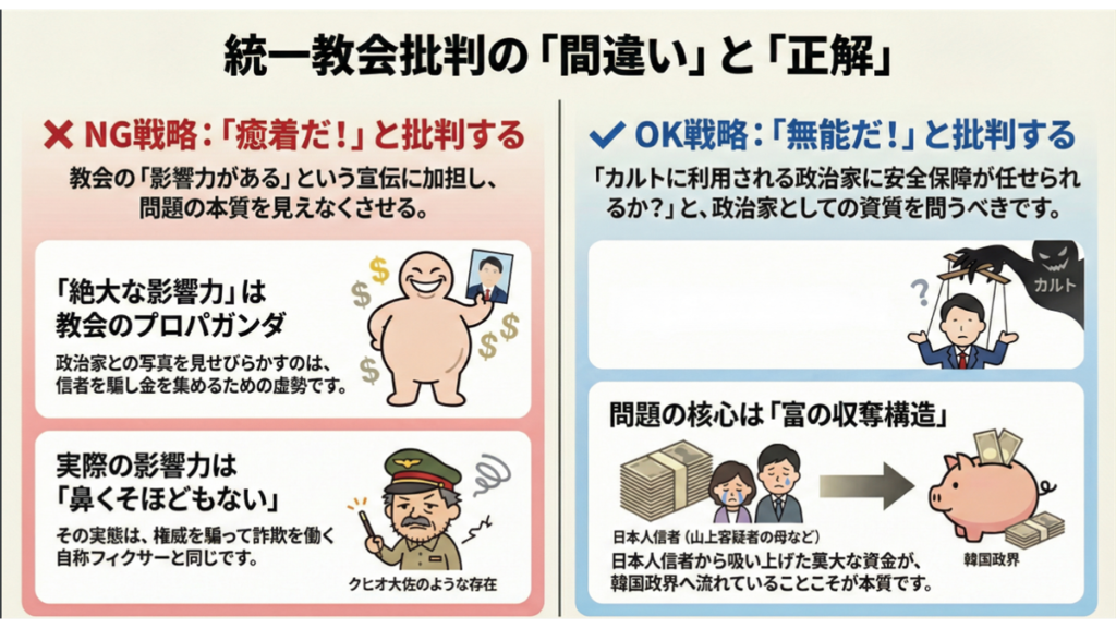 「自民党と統一教会の癒着」という論点に固執する批判は、善意から発せられたものであっても、結果的にカルト教団を利し、守るべき被害者をさらに傷つけるという悲劇的な帰結を招いています。それは倫理的に許されないだけでなく、戦略的にも完全に誤ったアプローチです。