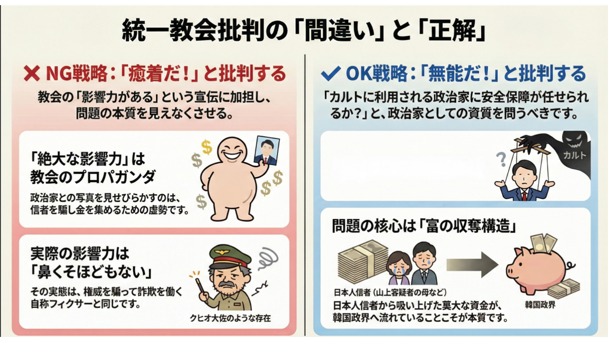 この種の攻撃は、教団の詐欺行為という「事実」と、政治家の判断力の欠如という「現実」に基づいているため、極めて効果的です。相手は陰謀論で反論することも、事実を否定することもできません。