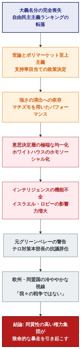 【結論】 アメリカは「自由民主主義」の絶対的な地位から転落し、大義名分すら投げ捨てた。世論とポリマーケットに振り回されるトランプ政権は、支持率維持のための「マチズモ(男らしさ)」に依存。結果としてホワイトハウスは極度に均一化(ホモソーシャル化)し、インテリジェンスのプロフェッショナルが愛想を尽かして辞任する異常事態へと陥っている。同質性の高い集団がいかに致命的な判断ミスを犯すか、その恐るべき実態がここにある。