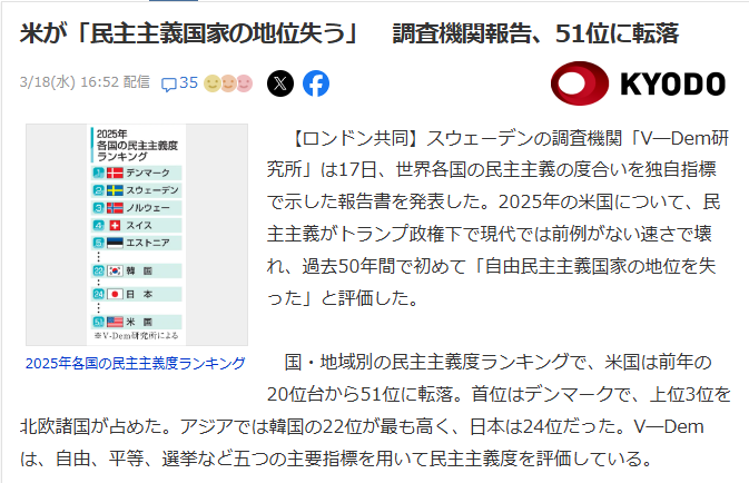 - 「自由主義の旗手」からの陥落: スウェーデンの研究機関のデータが示す通り、米国は司法やメディアへの圧力により自由民主主義の地位を失い、むき出しのアメリカへと変質した。