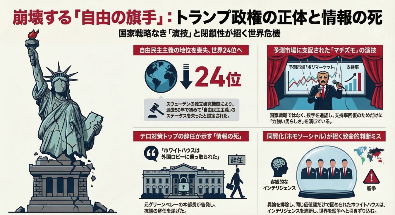 スウェーデンの独立研究機関が発表したレポートによれば、アメリカは過去50年で初めて「自由民主主義の地位」を失い、世界24位へと転落した。しかし、アメリカの覇権主義は今に始まったことではない。トランプ政権の真の異常性は、歴代政権が纏(まと)ってきた「自由と民主主義の守護者」という大義名分すら捨て去り、剥き出しの利己主義を隠さなくなった点にある。