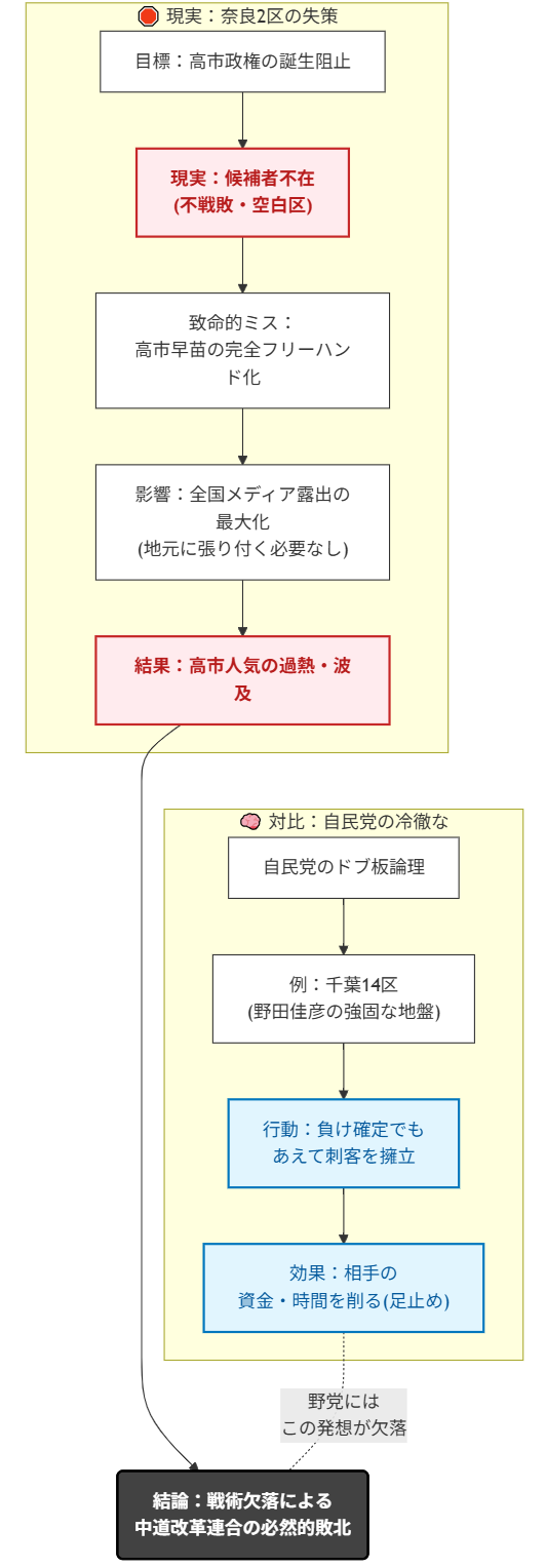 1. 奈良2区の空白は利敵行為:高市早苗氏に対抗馬を立てないことで、彼女に「地元に張り付かなくてよい」というフリーハンドを与え、全国でのメディア露出と集票活動を許している。