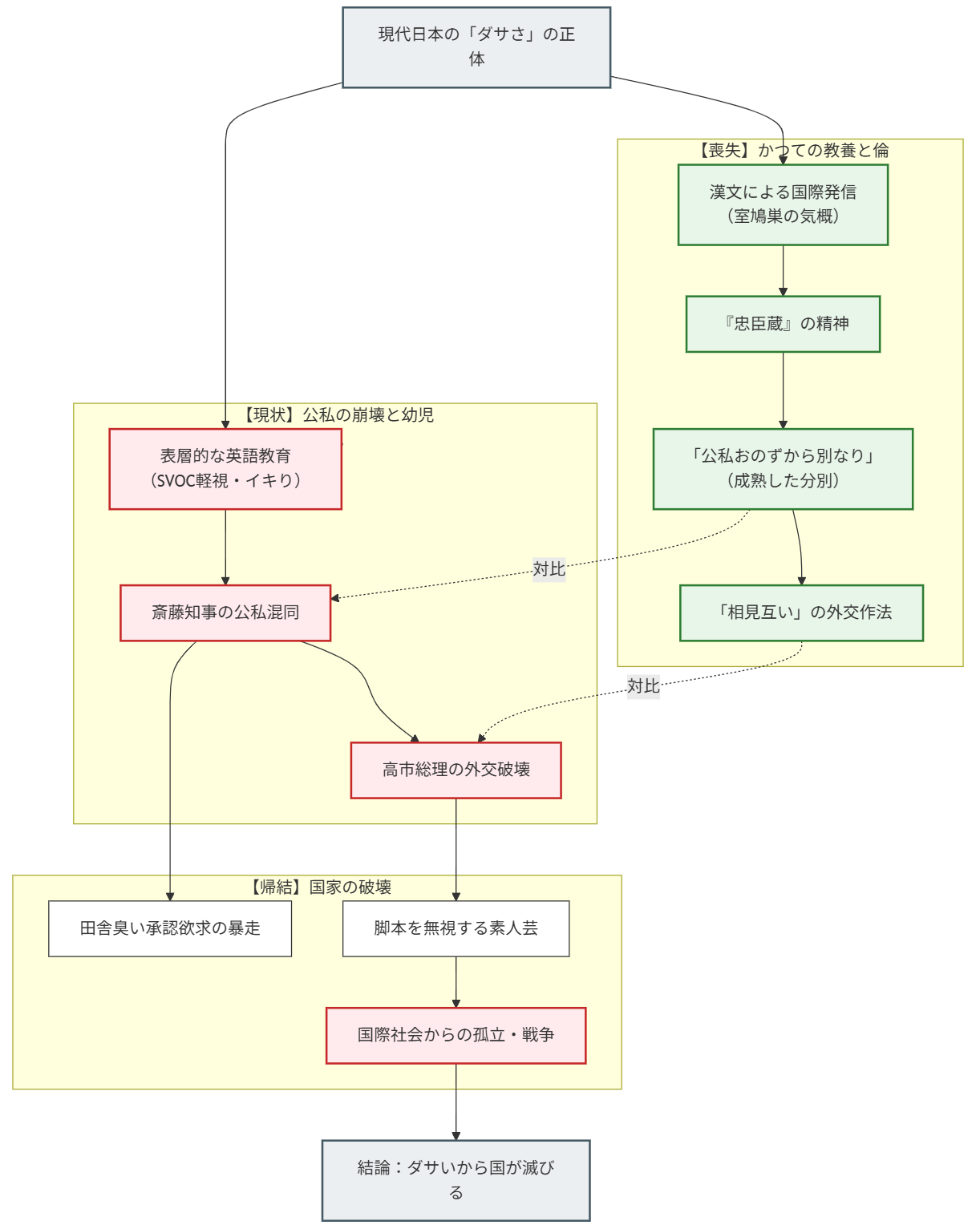 【結論】 現代日本政治の混乱は、全て「公私の別」を失った「ダサさ」に起因する。かつての日本人が『忠臣蔵』や漢文を通じて持っていた「高度な倫理観」と「国際感覚」を喪失した結果、我々は斎藤知事のような田舎臭い公私混同や、高市総理のような外交の「舞台破壊」を許してしまっている。