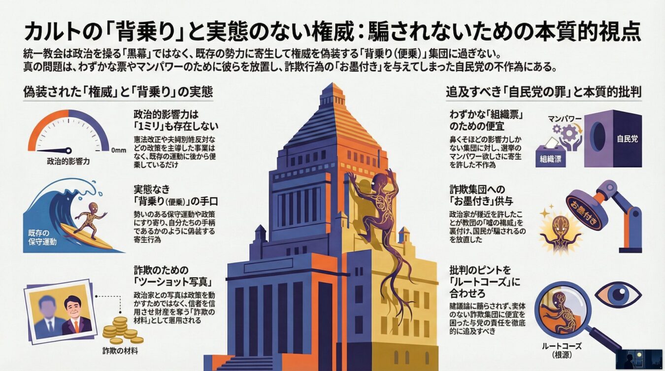 【結論】 統一教会の政治への影響力は世間で言われているほど強大なものではなく、実態は単なる「寄生虫」に過ぎない。我々が本当に批判すべきは、教団の教義ではなく、影響力を持たない詐欺集団の寄生をわずかな票欲しさに許容し、彼らの詐欺行為の「権威付け」に利用された自民党のモラルの欠如である。