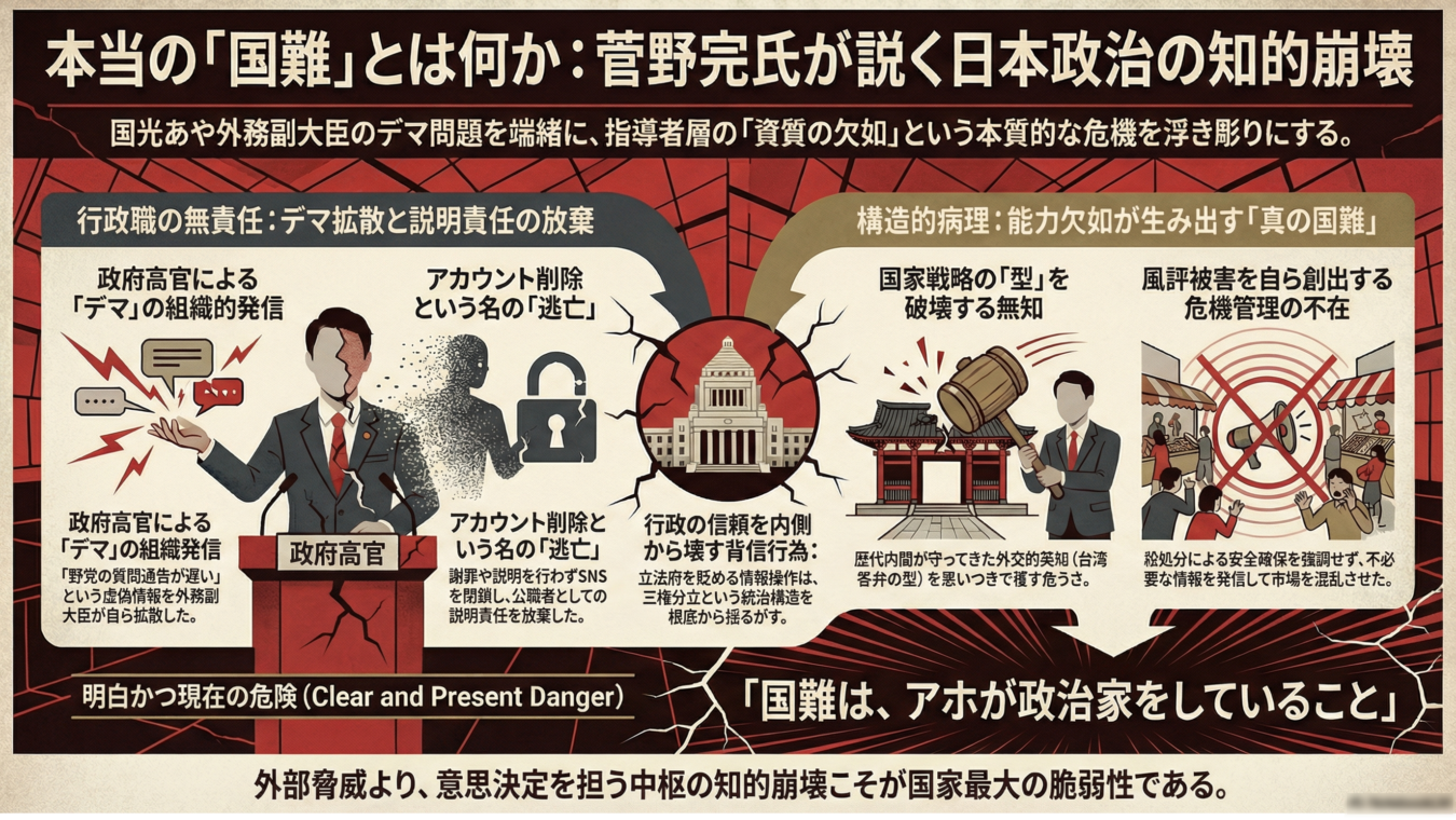 菅野氏は、我が国が直面する真の危機について、次のような核心的なテーゼを提示する。「国難は中国の軍拡ではなく、アホが政治家をしていること」である、と。この視点に立てば、国光氏による一連の行動――デマの拡散、二度にわたる官房長官からの厳重注意、そして説明責任を放棄したSNSアカウントの削除――は、単なる個人の資質の問題を超え、日本の統治能力そのものが蝕まれている現状を象徴する、極めて重要なケーススタディとして立ち現れる。