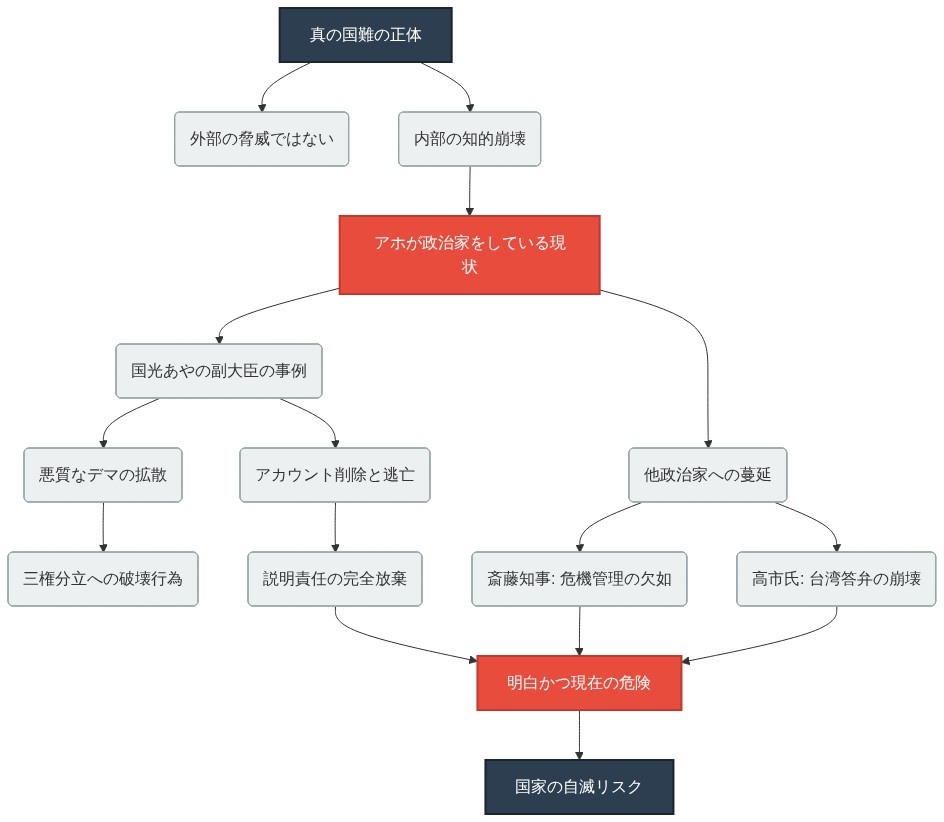 【結論】 現在の日本が直面する真の「国難」とは、中国の軍拡や台湾有事といった外部の脅威ではない。国家の中枢を担う政治家たちが決定的に劣化し、「アホが政治家をしている」という内部の知的崩壊こそが最大の危機である。国光あやの外務副大臣によるデマの拡散とアカウント削除という無責任な逃亡劇は、この国の統治能力が末期的な状況にあることを示す「明白かつ現在の危険(Clear and Present Danger)」に他ならない。