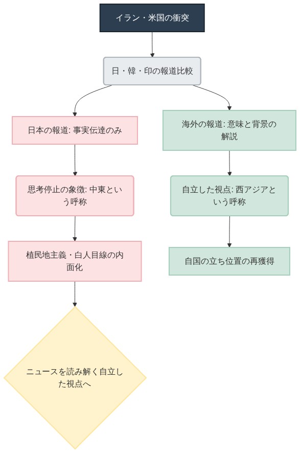 【結論】 私たちが日常的に使う「中東」という言葉には、イギリスを中心とした西欧の植民地主義的な視点が無批判に内面化されている。海外メディアの深い分析力と比較することで、日本の報道が陥っている「事実のみの羅列」と「世界観の欠如」という弱点が浮き彫りになる。