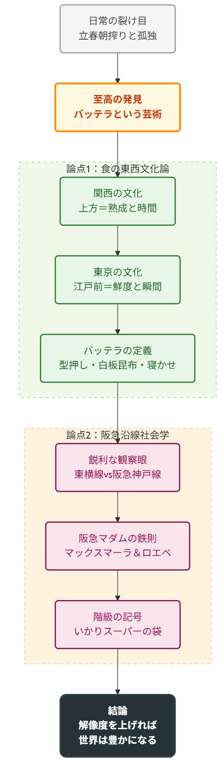 【結論】 「バッテラ」は単なる寿司ではなく、時間を味方につける関西独自の「熟成文化」の結晶である。そして、その味を解する関西人の美学は、阪急沿線住民の「制服」とも言えるファッションの記号性にも通底している。解像度を上げて街を見れば、そこには明確な文化の断層が存在するのだ。
