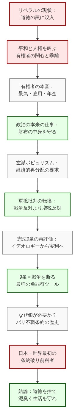 - 左派ポピュリズムの復権: 軍拡を「戦争への道」と観念的に批判するのではなく、「毎月お前の財布から2万円抜かれるぞ」と怒らなければならない。経済的再分配を放棄し、「中道」に逃げ込んだ野党は役割を果たしていない。