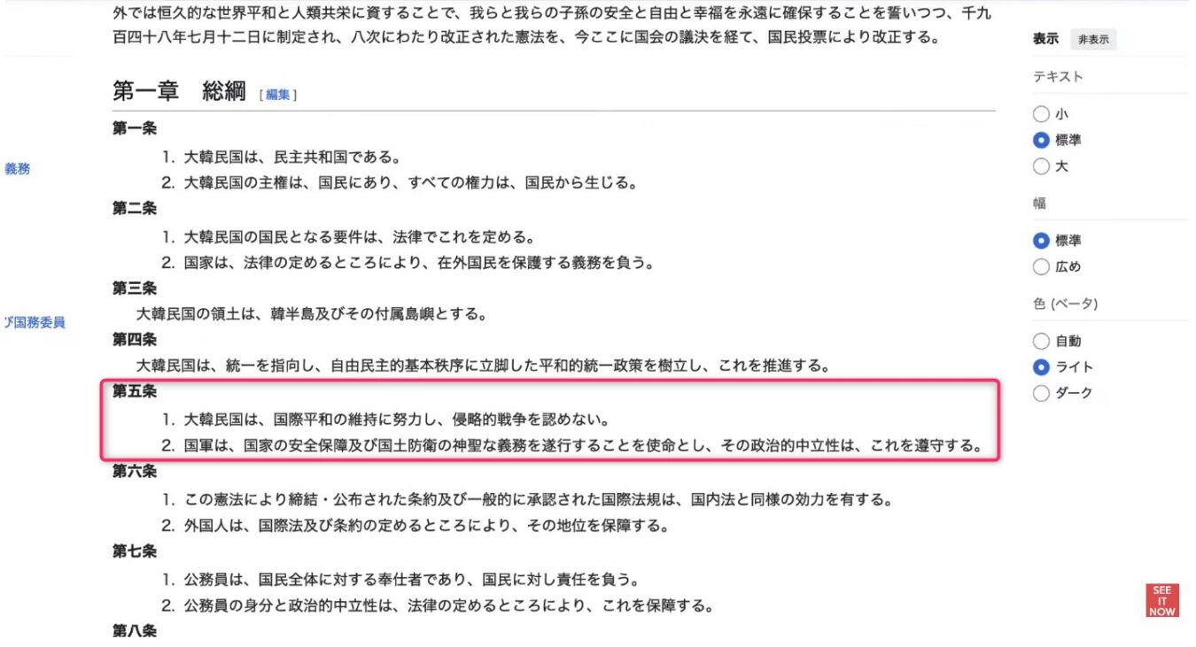 しかし、彼らが理想とする「自衛隊を明記しつつ侵略戦争を否定する憲法」は、実はすでに隣国に存在する。大韓民国憲法(第5条)である 。