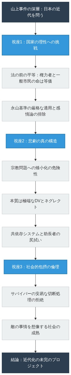 したがって、山上事件への応答は、単に一人の被告人をどう処遇するかという問題ではない。それは、日本という国が、真に成熟した近代国家へと移行するための、避けては通れない知的・倫理的課題なのである。ゆえにこの事件は、もはや一人の男の物語であることをやめ、近代化に向けた日本の旅路における、未だ完結していない最終章そのものとなるのだ。