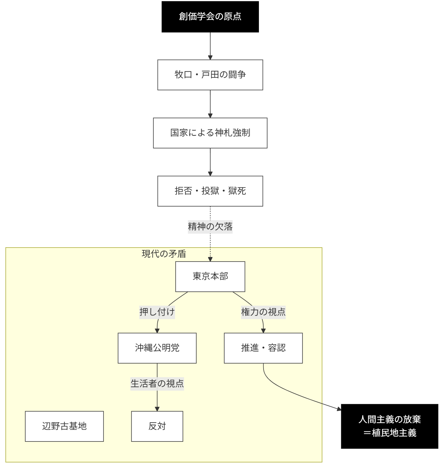 【要約】 公明党の原点は、国家神道による思想統制(神札の強制)に対し、投獄されても拒否し続けた牧口常三郎・戸田城聖の「抵抗の精神」にあります。しかし現在の公明党本部は、沖縄県本部が反対しているにもかかわらず、東京の論理で「辺野古推進」を押し付けています。これはかつて創価学会が闘った「国家権力の横暴」そのものであり、沖縄に対する植民地主義的差別です。