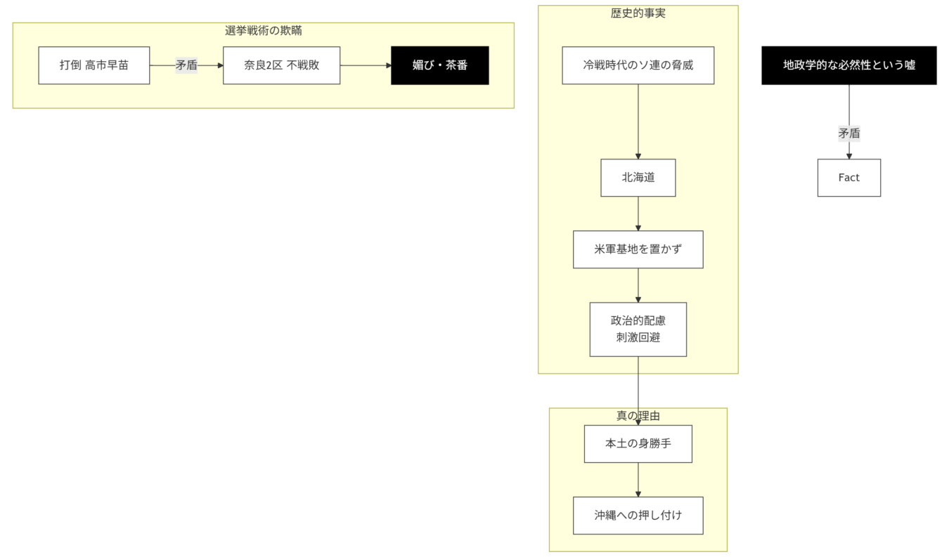 【要約】 「沖縄の基地は地政学的に必要」という言説は嘘です。冷戦期、対ソ連の最前線だった北海道に米軍基地は置かれませんでした。理由は「ソ連を刺激しないため」です。つまり、沖縄への集中は軍事的必然性ではなく、本土の政治的都合による差別に過ぎません。また、「打倒・高市早苗」を掲げながら、彼女の選挙区(奈良2区)に候補を立てない態度は、戦うふりだけの完全な茶番です。