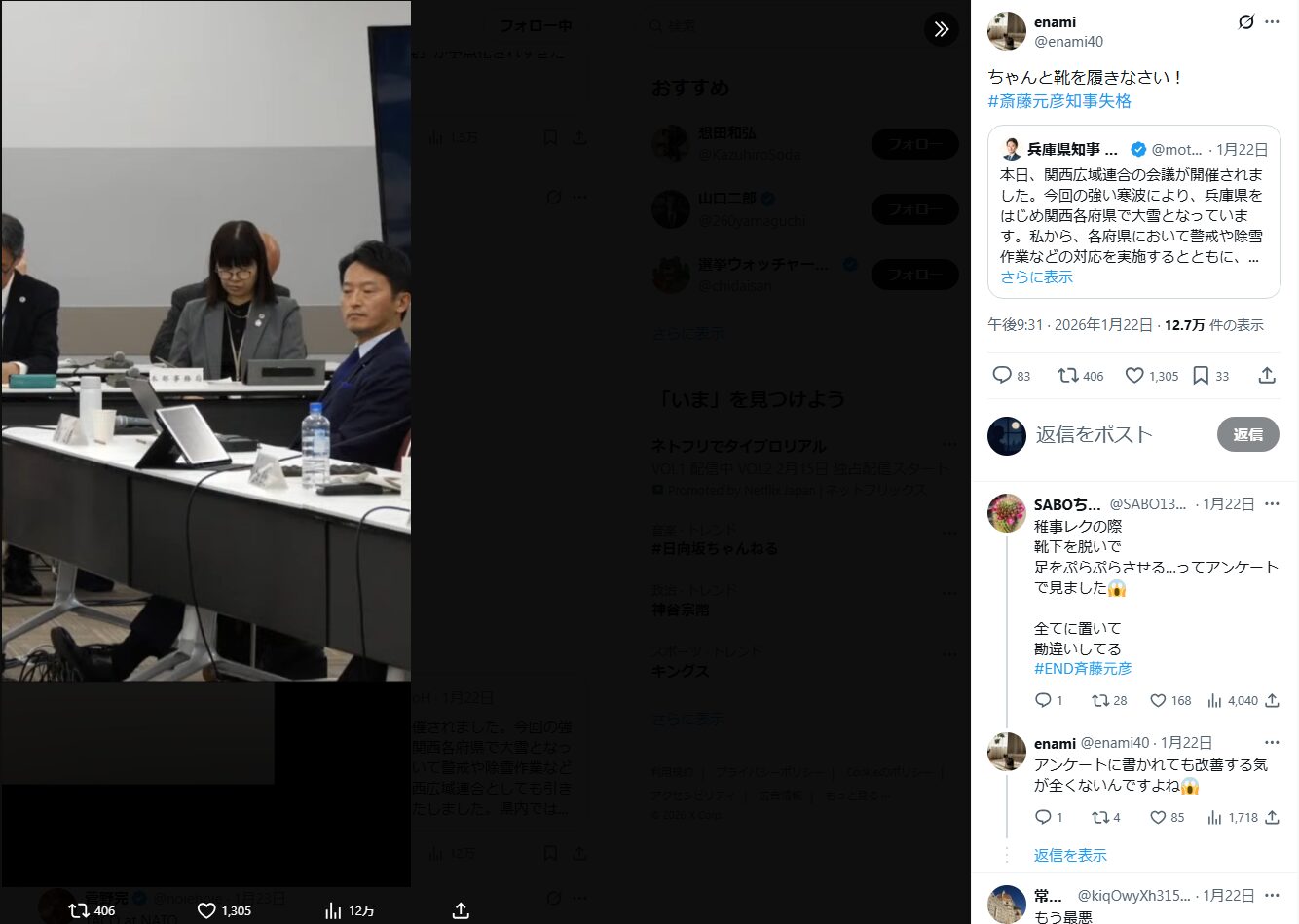 - 斎藤元彦の「他者性」欠落:他県の幹部が待つ会議で靴を脱ぎ、貧乏ゆすりをする姿は、周囲(他者)が完全に見えていない「精神的独房」の中にいる証拠である。
