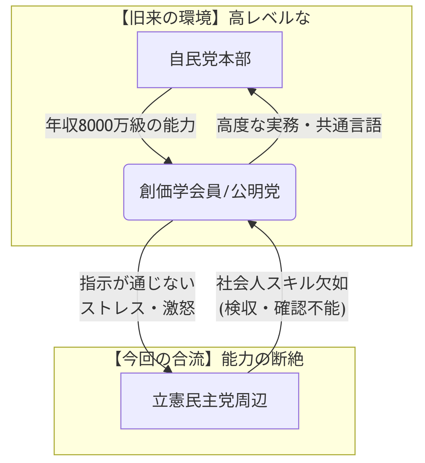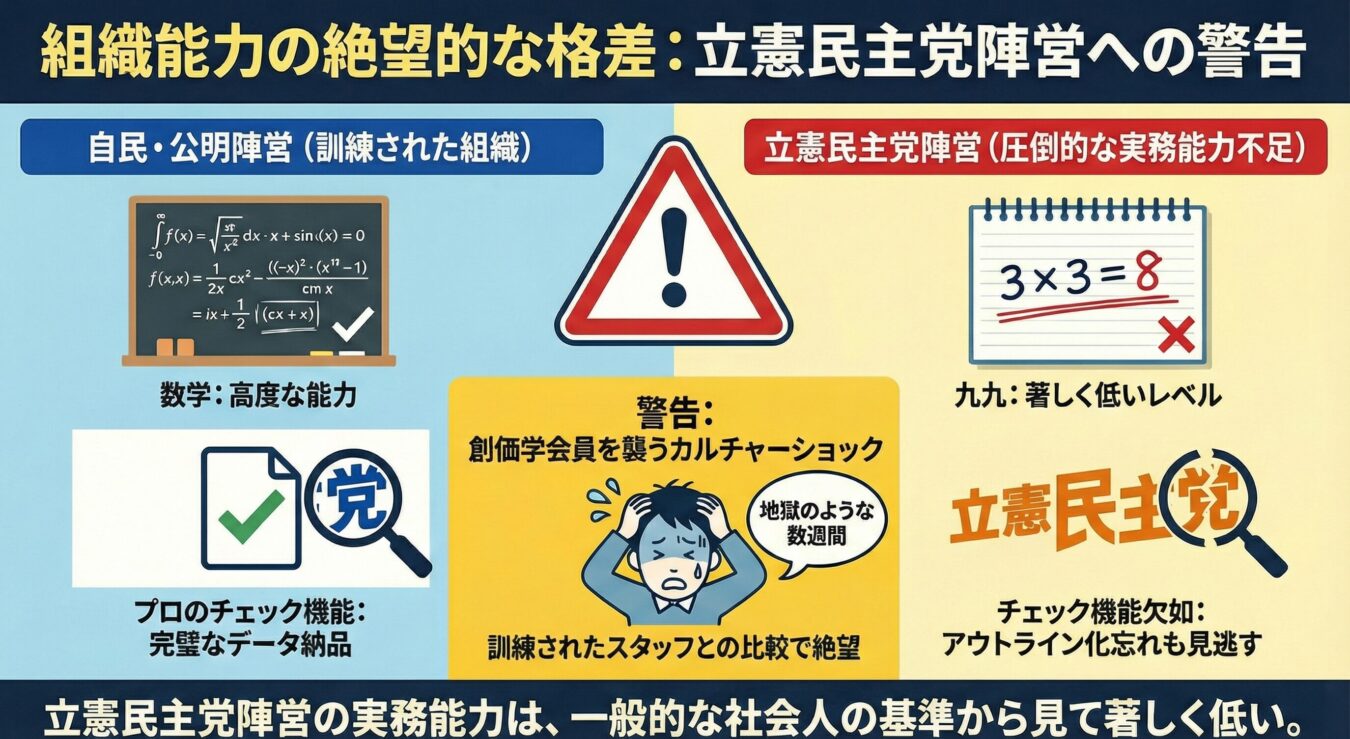 これまで30年間、公明党・創価学会は自民党とタッグを組んできました。自民党の本部(平川町)にいる人間は、民間企業に行けば年収8000万円スタートでもおかしくないほどの極めて高い実務能力を持つエリート集団です。そのような「プロ」と仕事をしてきた創価学会員が、これからの選挙戦で立憲民主党側の人間と接触した際、「こんな人間見たことない」というレベルの未熟さに直面することになります。これは単なる悪口ではなく、現場を知る人間としての切実な「予言」なのです。