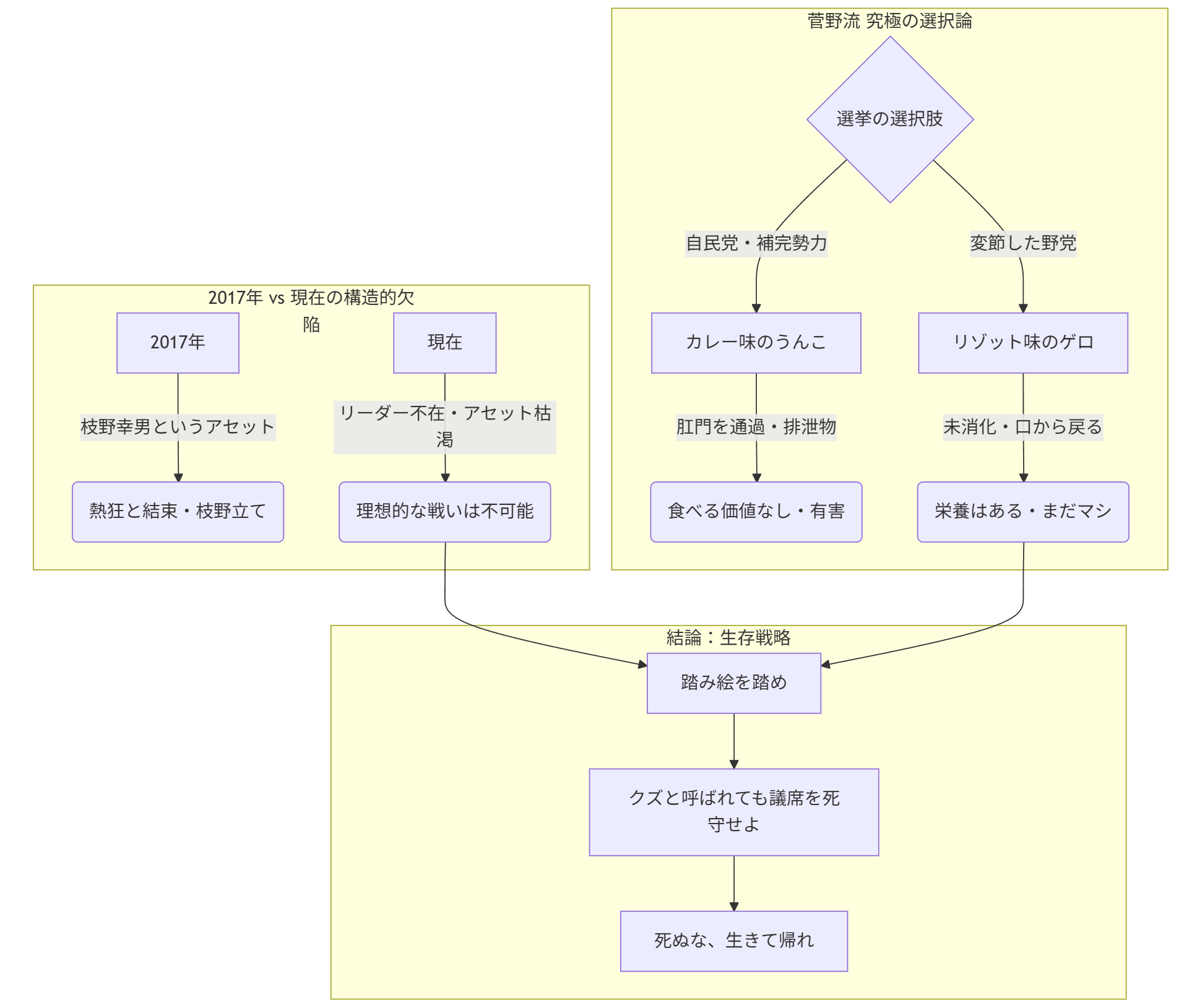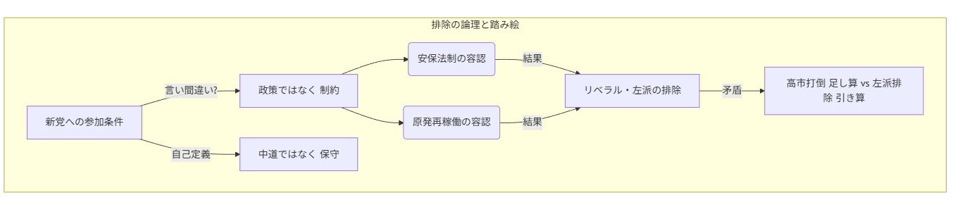 3. 勝利の方程式との矛盾:打倒・高市自民党を掲げながら、左派を切り捨てる「引き算」を行うことは、選挙戦術上の「足し算」と矛盾しており、真の目的が選挙勝利ではないことを示唆している。