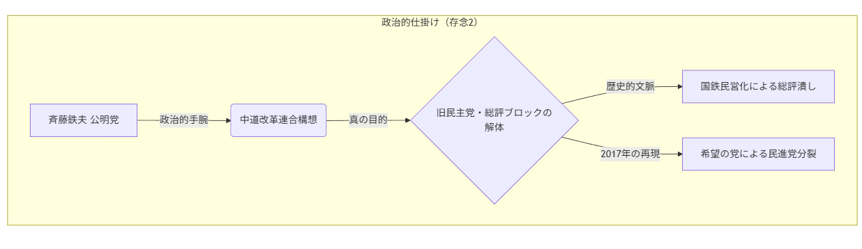 1. 歴史は繰り返す(2017年の再来):斉藤鉄夫氏の手腕は、かつて小池百合子氏が行った「排除の論理」をより巧妙に再現しており、立憲民主党の実質的な解体を狙っている。