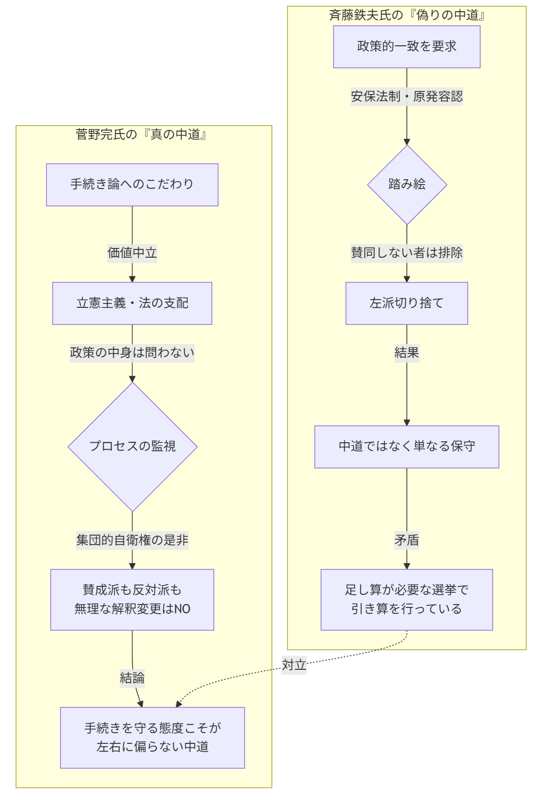 【結論】 菅野完氏は、「中道」の定義を政策的な左右の中間地点ではなく、「手続き論(立憲主義)への厳格なこだわり」であると再定義します。菅野氏は、斉藤鉄夫氏(公明党)が掲げる「政策の一致(安保法制・原発容認)」を条件とした新党構想は、多様な意見を包摂する「中道」ではなく、単なる「排除の論理」であり「保守」であると断じます。真の中道とは、政策の中身(コンテンツ)の是非を超えて、法案成立の「プロセス」が憲法秩序に則っているかを監視する価値中立的な態度(コンプライアンス)にこそ宿ると結論づけました。