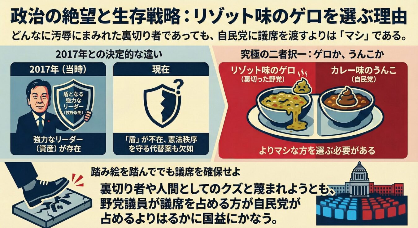 それでもなお、私は野党議員に「このラブホテルに入れ」と言います。外で野垂れ死ぬよりは、インチキな看板の下でも生き残る方が、日本の民主主義にとってまだマシだからです。