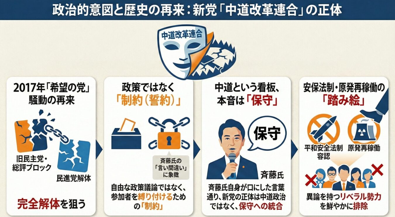 【結論】 今回の「中道改革連合」を巡る動きは、単なる野党再編ではない。これは2017年の「希望の党」騒動の再来であり、公明党・斉藤鉄夫氏による**「旧民主党・総評ブロック(社会党系)の完全解体」**を目的とした高度な政治的策略である。新党が掲げる条件は「政策」ではなく、踏み絵としての「制約」であり、その本質は「中道」の皮を被った「保守」による野党の分断と選別にある。