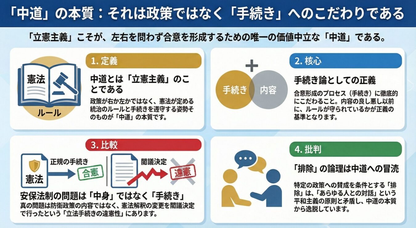 • 「中道」とは、右でも左でもない曖昧なポジションではなく、価値中立な「手続き」を厳格に守る態度のことである。
